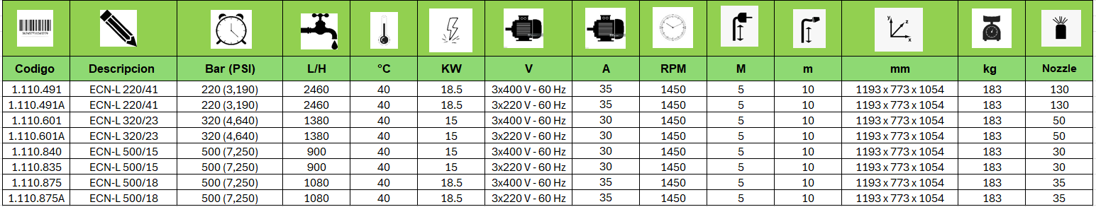 500 bar (7,250 psi) con 15 lpm, en 440 V o 220 V a 60 Hz