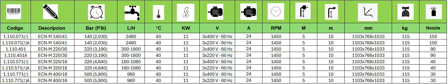 400 bar (5,800 psi) con 16 lpm, en 440 V o 220 V a 60 Hz